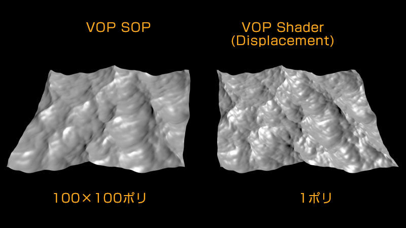 左がVopSopで変形させたグリッドで、右が一枚のポリゴンをDisplacementで変形させたものです。